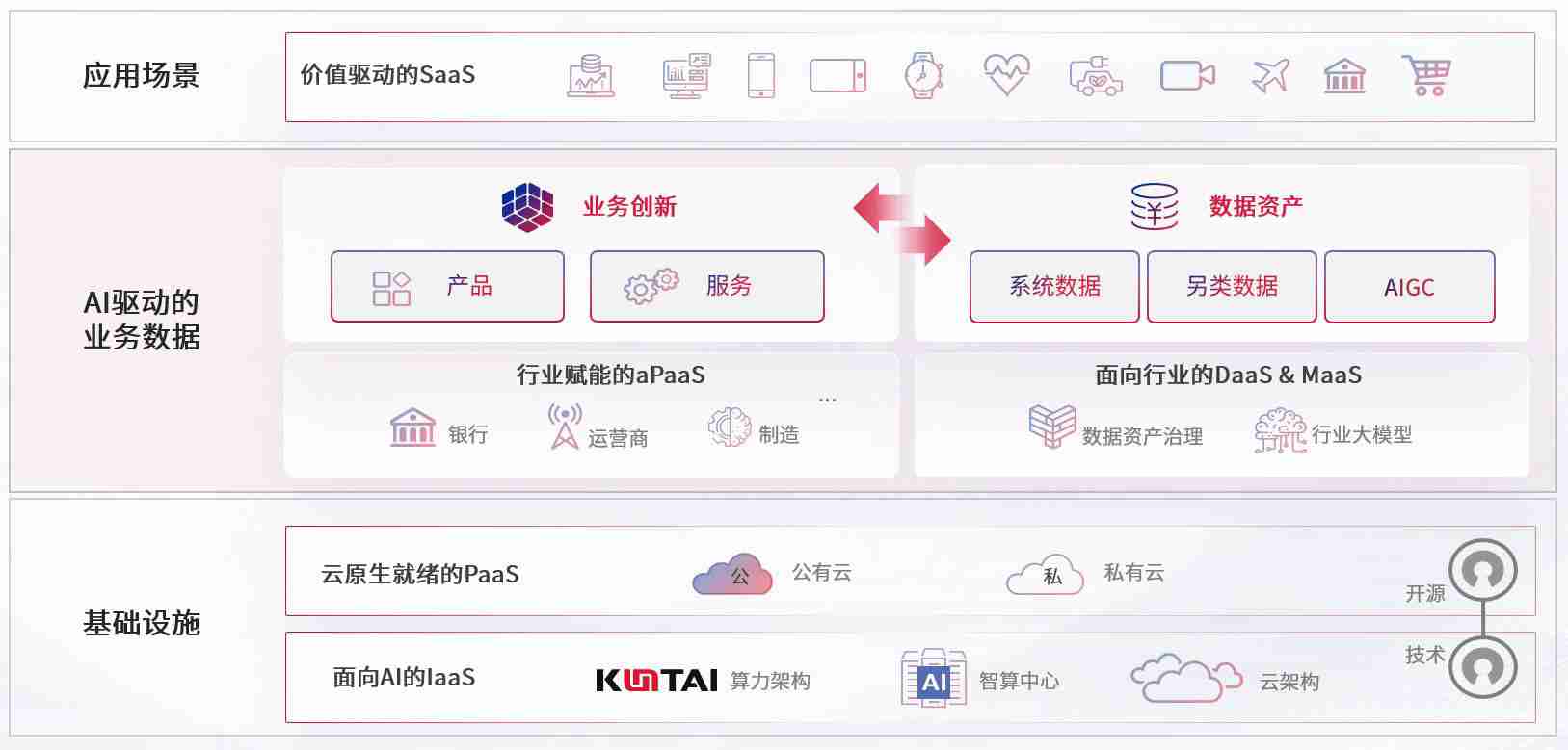 数字时代,,,围绕企业数字化转型的关键要素,,KY开元数码开创性的提出数云融合战略和技术体系框架,,着力在云原生、、、数字原生、、AI原生和信创产业上架构产品和服务能力,,,为处在不同数字化转型阶段的快消零售、、、、汽车、、、、金融、、医疗、、、、政企、、、教育、、运营商等行业客户提供泛在的敏捷IT能力和融合的数据驱动能力,,,构建跨界融合创新的数字业务场景和新业务模式,,,助力企业级客户建立面向未来的核心能力和竞争优势,,全面推动社会的数字化、、、、智能化转型升级。。。